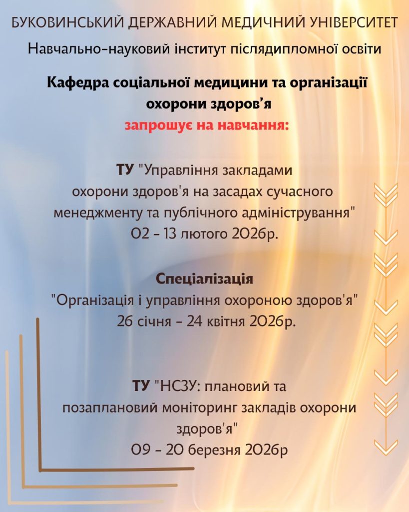 Навчально-науковий інститут післядипломної освіти Буковинського державного медичного університету на базі кафедри соціальної медицини та організації охорони здоров’я проводить: